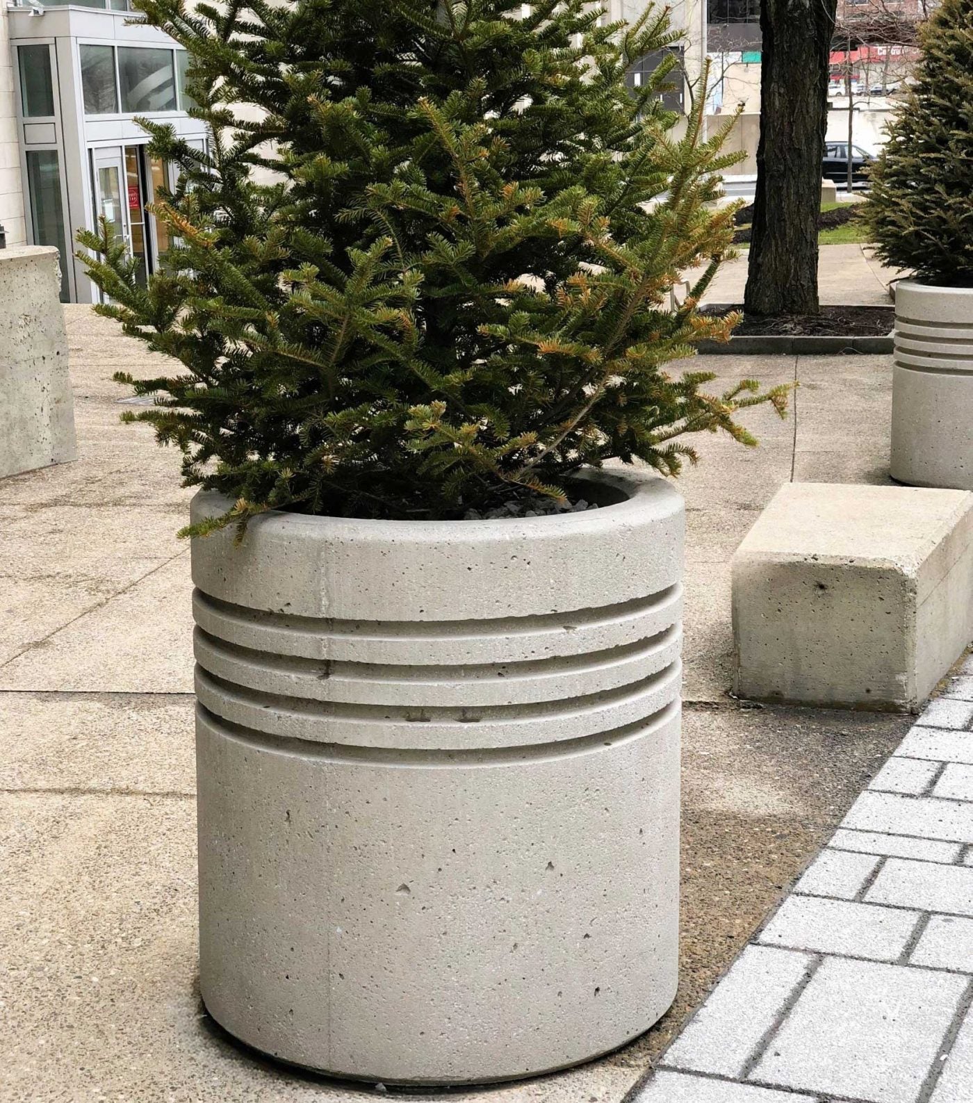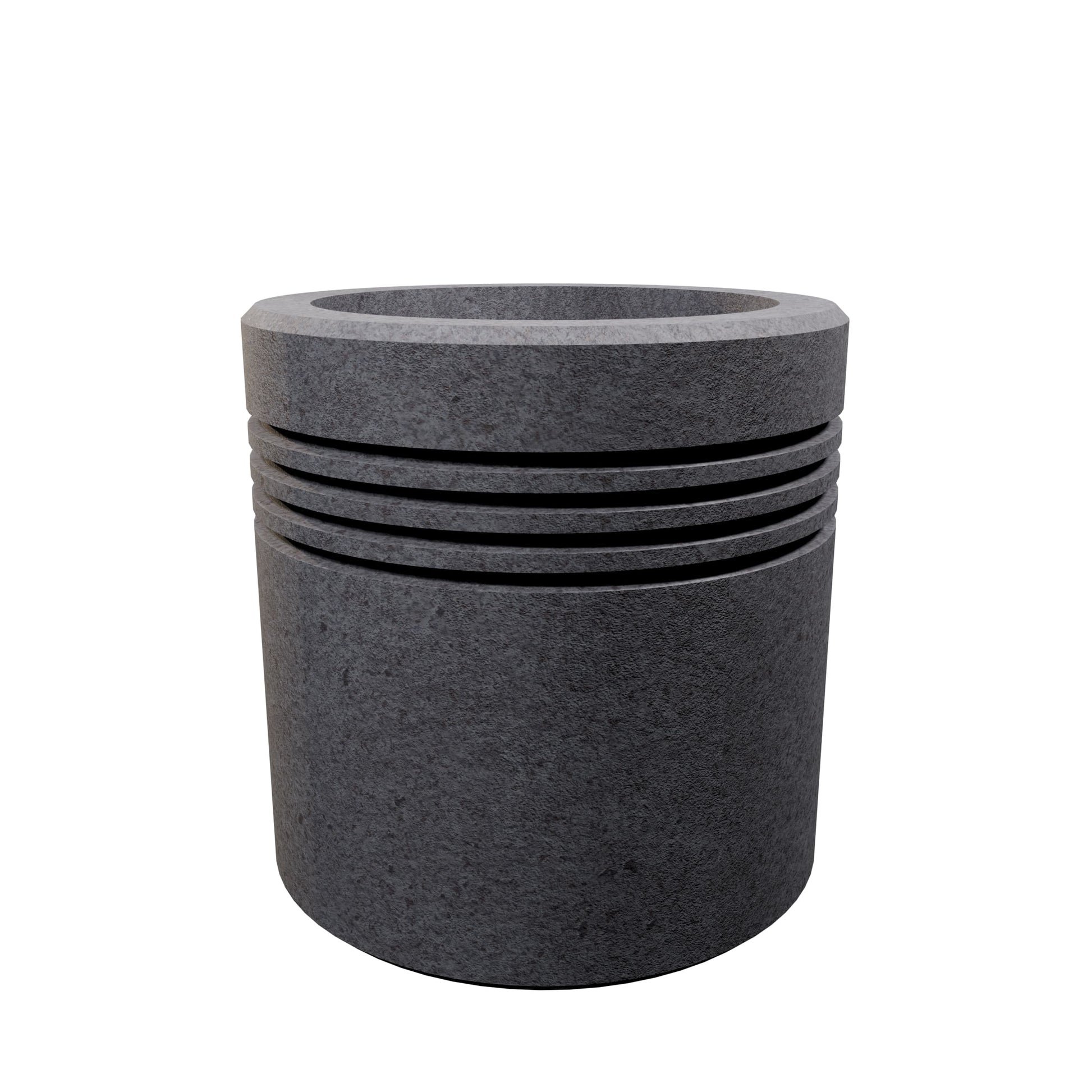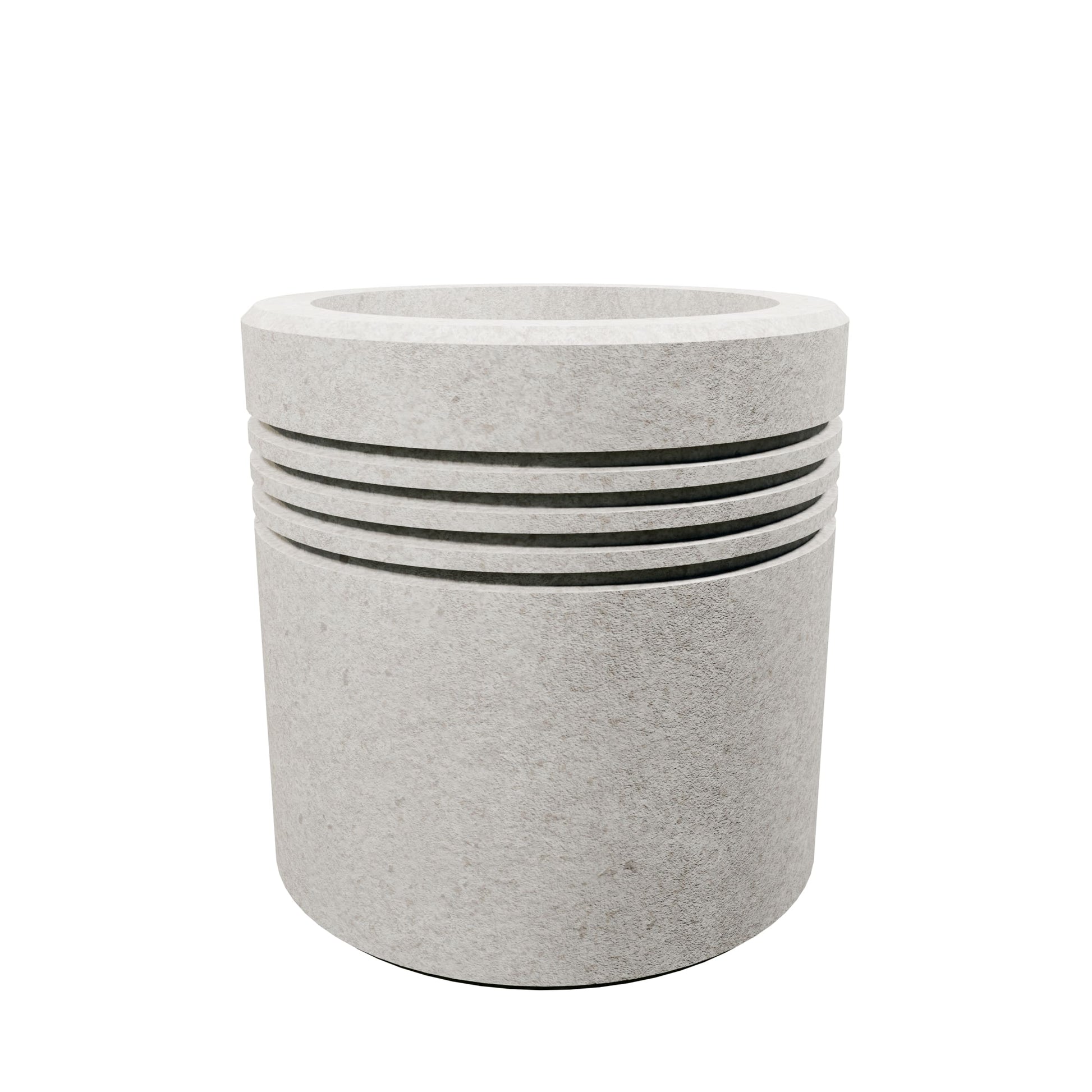 Le bac à fleurs Ciclo (MU-75) est circulaire en béton avec un fini lisse et des rainures horizontales.