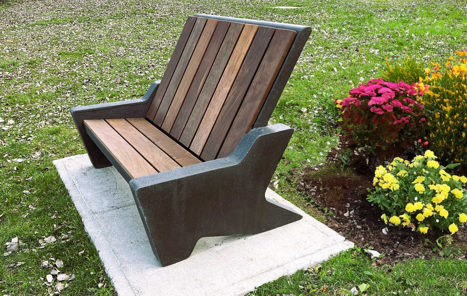 Une chaise lounge en béton pour l’extérieur pouvant accueillir jusqu’à deux personnes confortablement. Personnalisez-la avec un revêtement de bois IPE ou de plastique recyclé!
